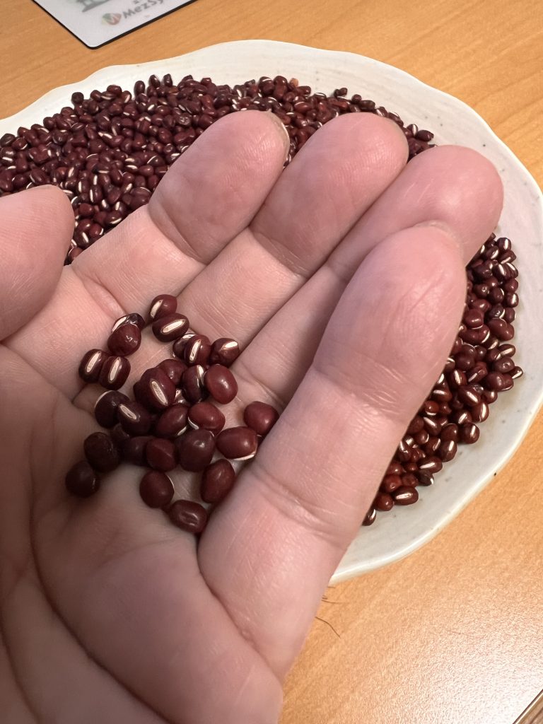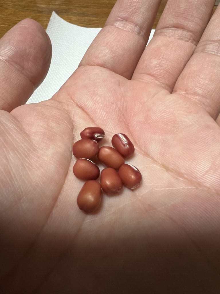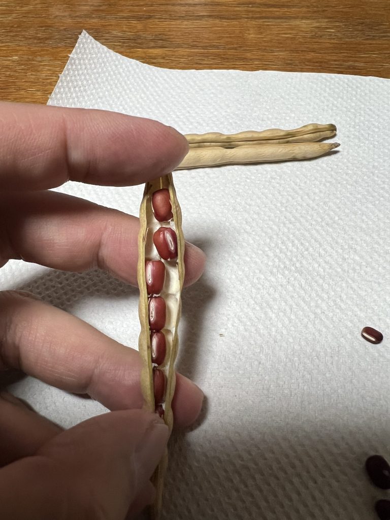 勢いよく小豆が飛ぶので、そっと気を付けながらさやを開けてみます! なんということでしょう!