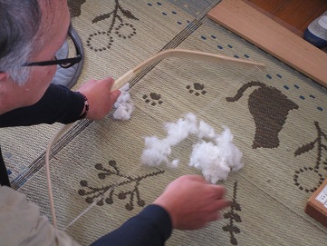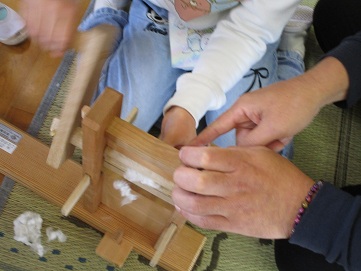 糸車だけではもったいないと思い、綿の実からどうやって糸になるのか?を実際に見せながら、綿繰り機、綿弓、糸車に触れてもらいました。